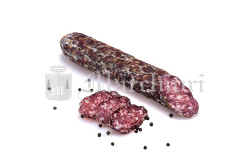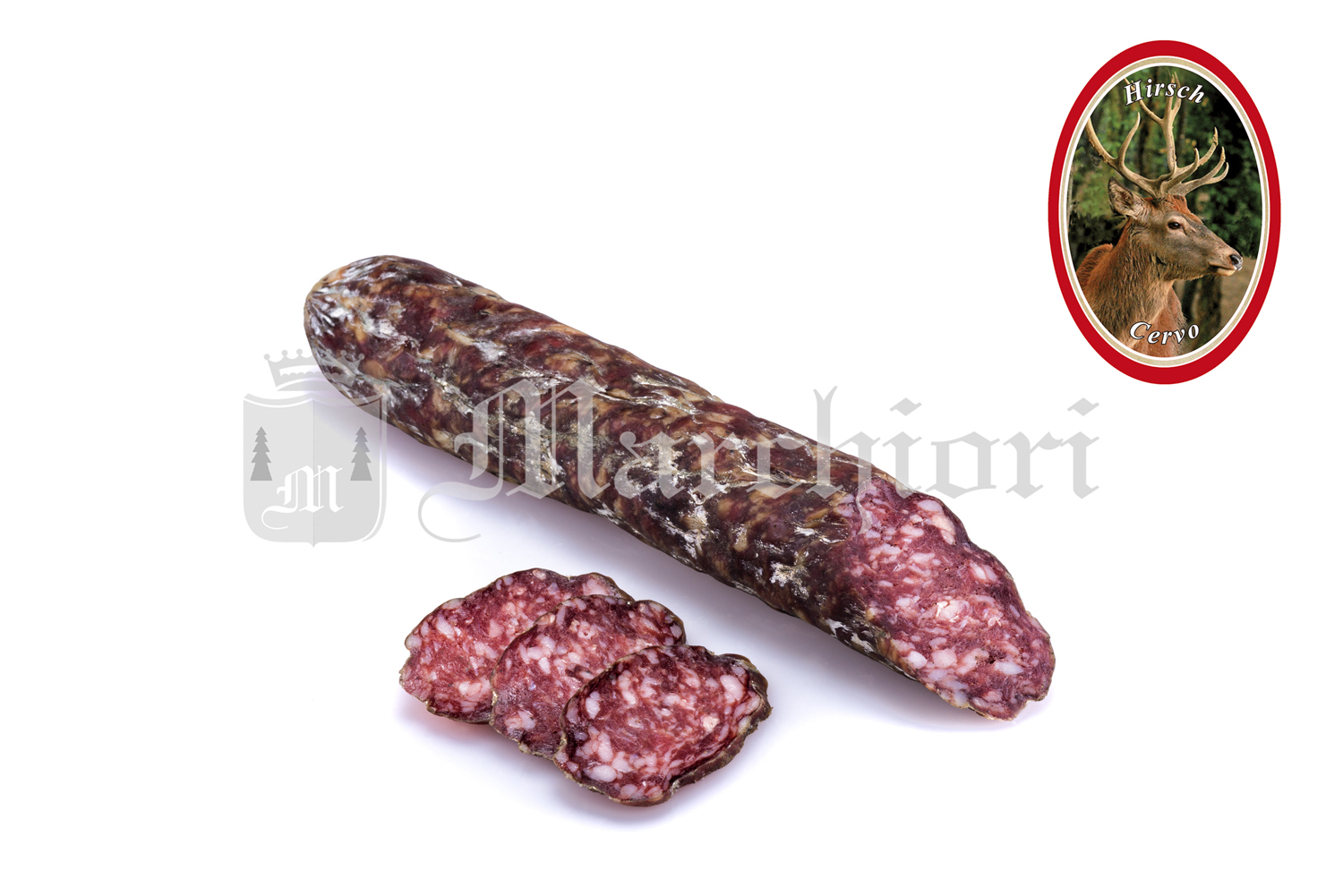 Ottenuto da carni magre di cervo mescolate nella giusta percentuale con spalla e pancetta di suino che conferiscono un ottimo livello di morbidezza ed eleganza al prodotto. L’adeguata miscela di spezie e la delicata essicazione all’aria di montagna rendono eccellente il salame.